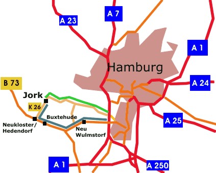 Folgen Sie dem Strassenverlauf über Neuwiedenthal, Neugraben, Neu Wulmstorf, Ovelgönne, Immenbecknach Neukloster/Hedendorf. Dort biegen Sie an der ersten Ampelkreuzung nach rechtsRichtung Altes Land / Jork auf die K 26.