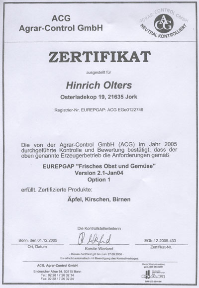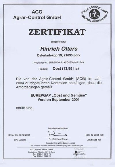 Um Sie, liebe Kundinnen und Kunden, von der Qualität unserer Obstproduktion zu überzeugen, lassen wir uns in ungegelmässigen Abständen auf "die Finger sehen". Hierbei werden alle relevanten Bereiche des Obstanbaus einer genauen Überprüfung durch ein unabhängiges Prüfinstitut unterzogen.